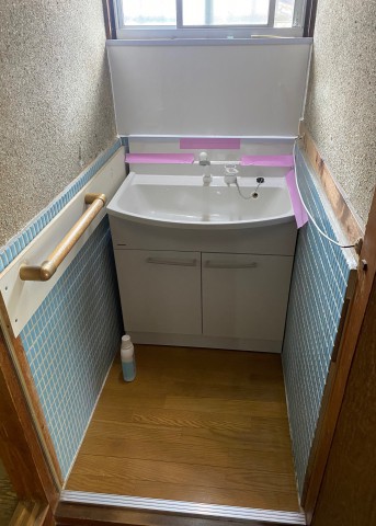 シャワー水栓の新規取付、洗濯水栓の新規取付、給湯管引込み+洗面台取付工事