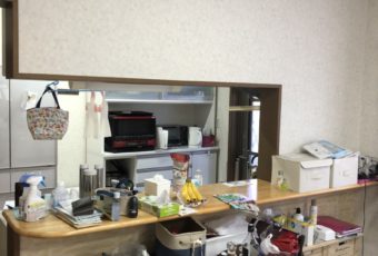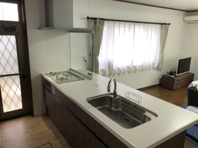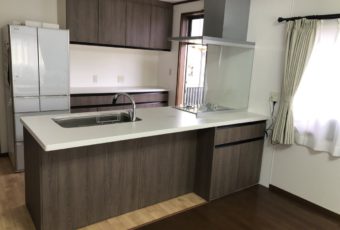 キッチンの垂れ壁を解体し、ペニンシュラ型のキッチンへリフォームさせていただきました。同時に浴室・洗面・トイレも取り替えました。