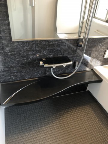 ワイドミラーとグラニットグレーの床で高級感溢れるお風呂になりました。